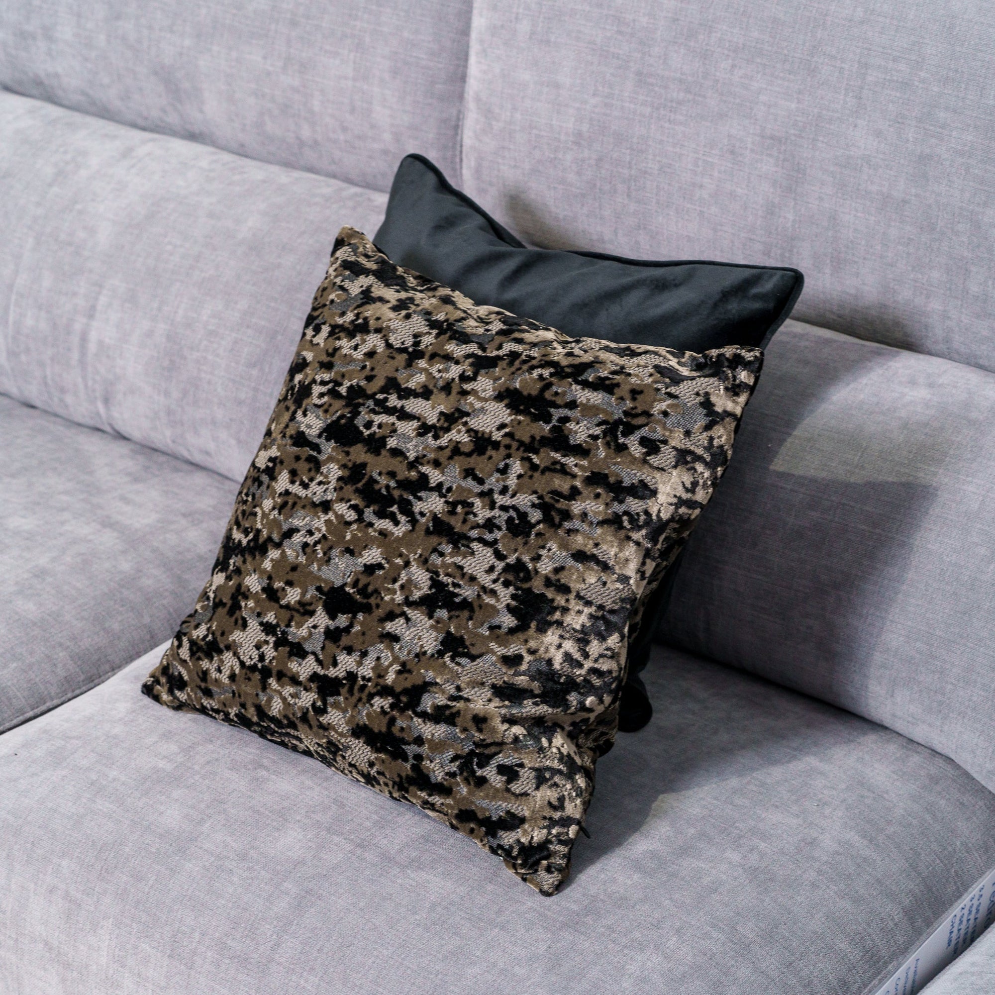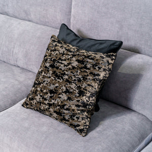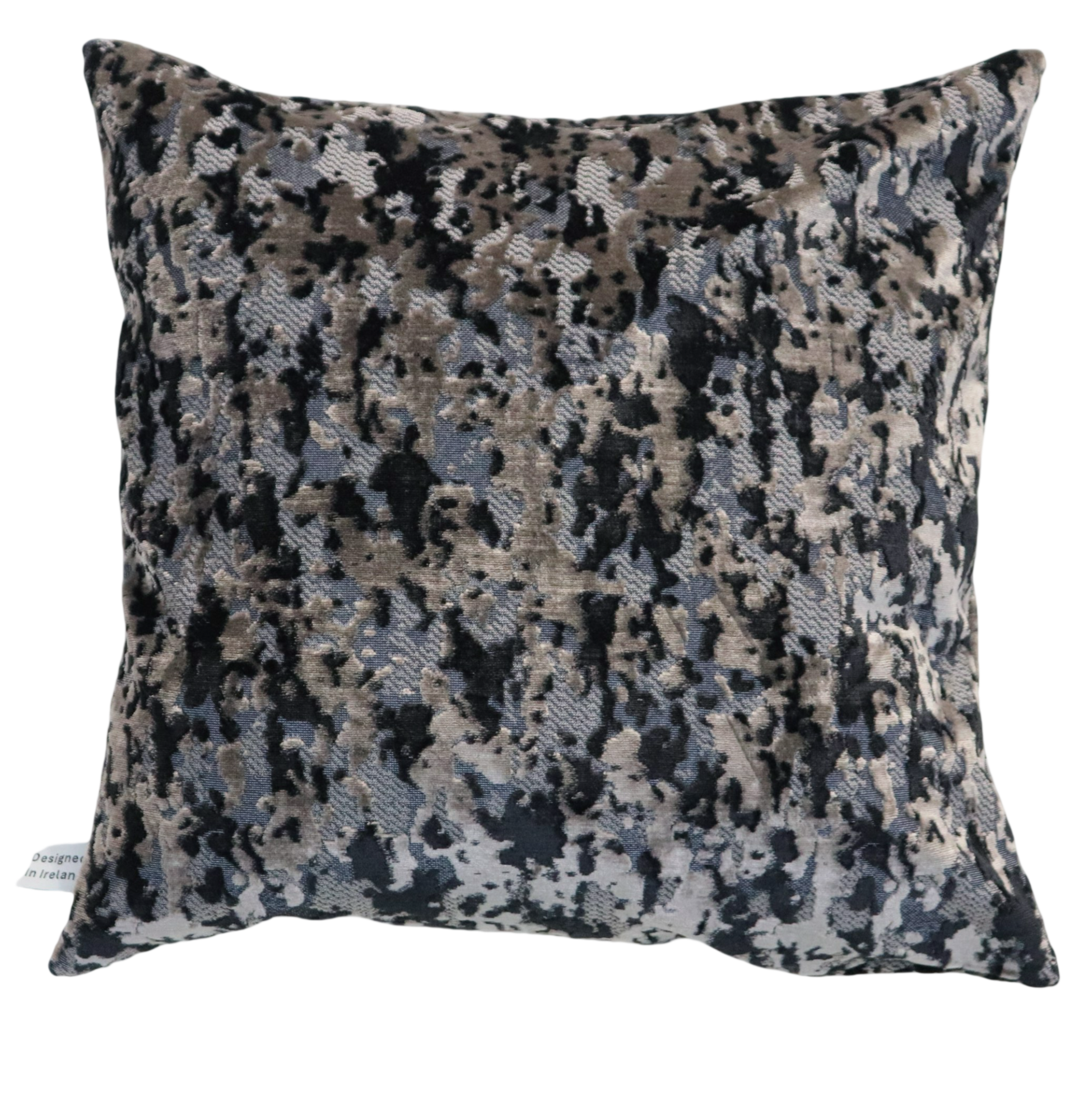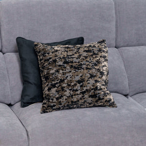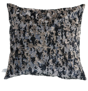 Woven in opulent cut-pile velvet, this piece features a mesmerizing abstract pattern in soft taupe, deep black, muted grey,— evoking the weathered beauty of natural stone or painted canvas. The velvet's soft sheen shifts subtly with the light, adding dimension and a sense of quiet luxury to any space.