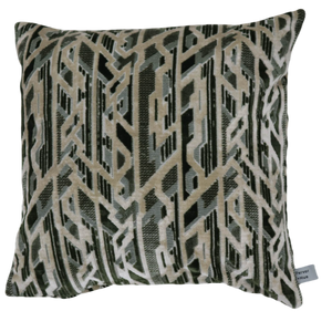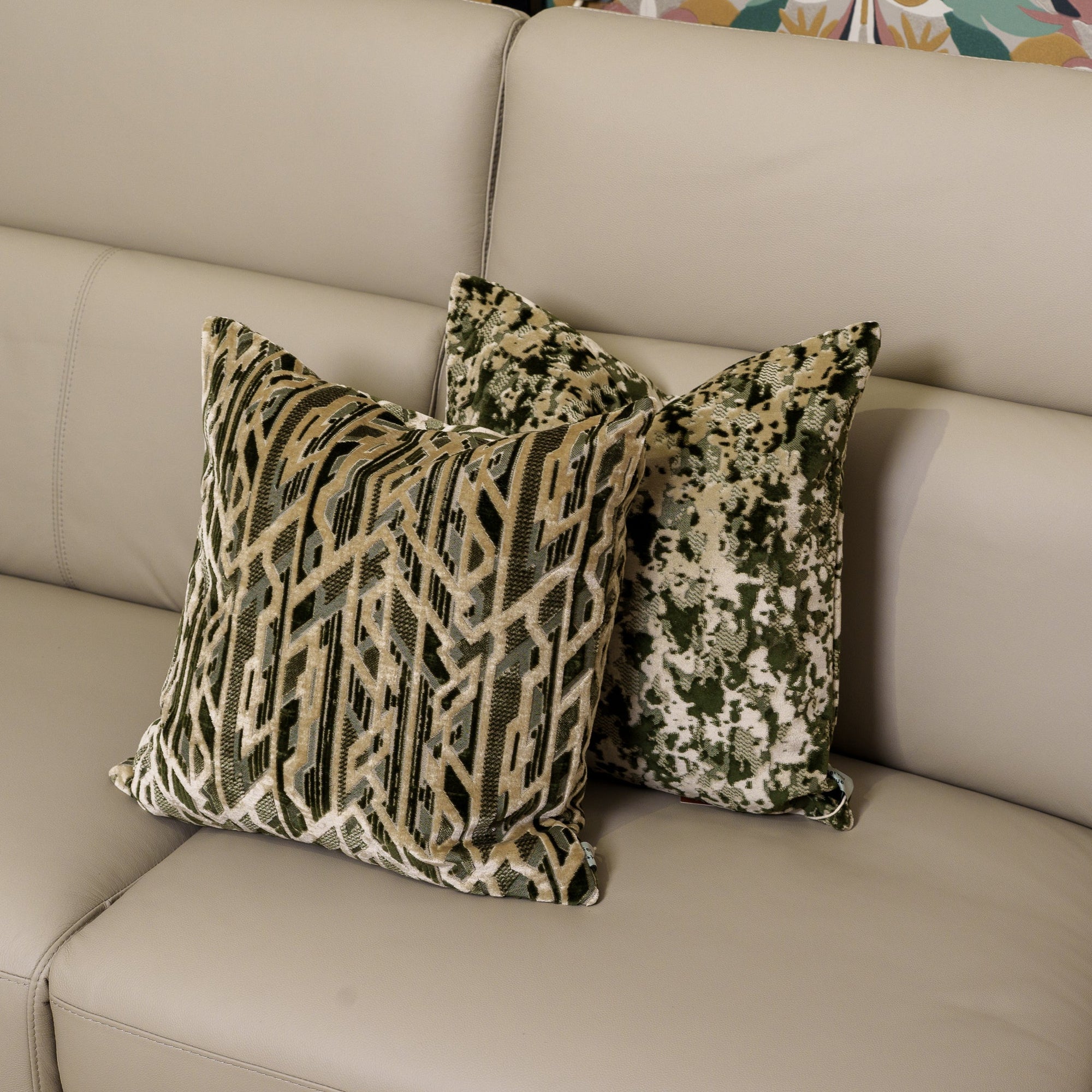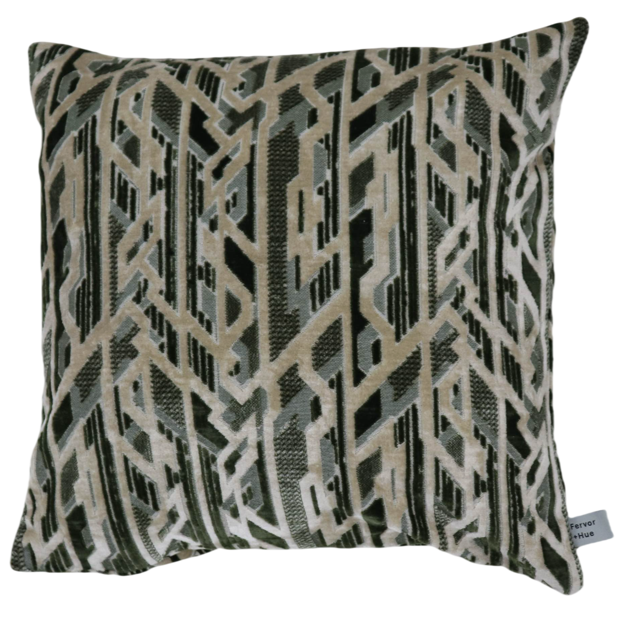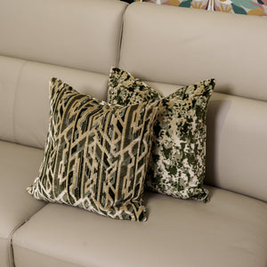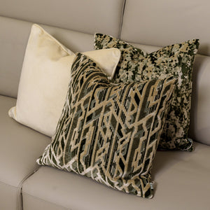 Elevate your interior story with the Studio Lyron Green cushion — a bold, modern statement rendered in plush, soft-touch velvet. This cushion features a sophisticated cut pile geometric pattern that evokes the clean lines of Art Deco architecture, reimagined in a refined forest green and earthy taupe palette. The rich hues and tactile depth lend instant elegance to your space, making it the perfect piece to build a layered, designer look.