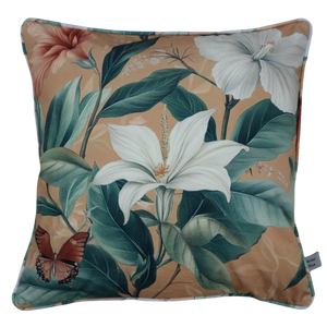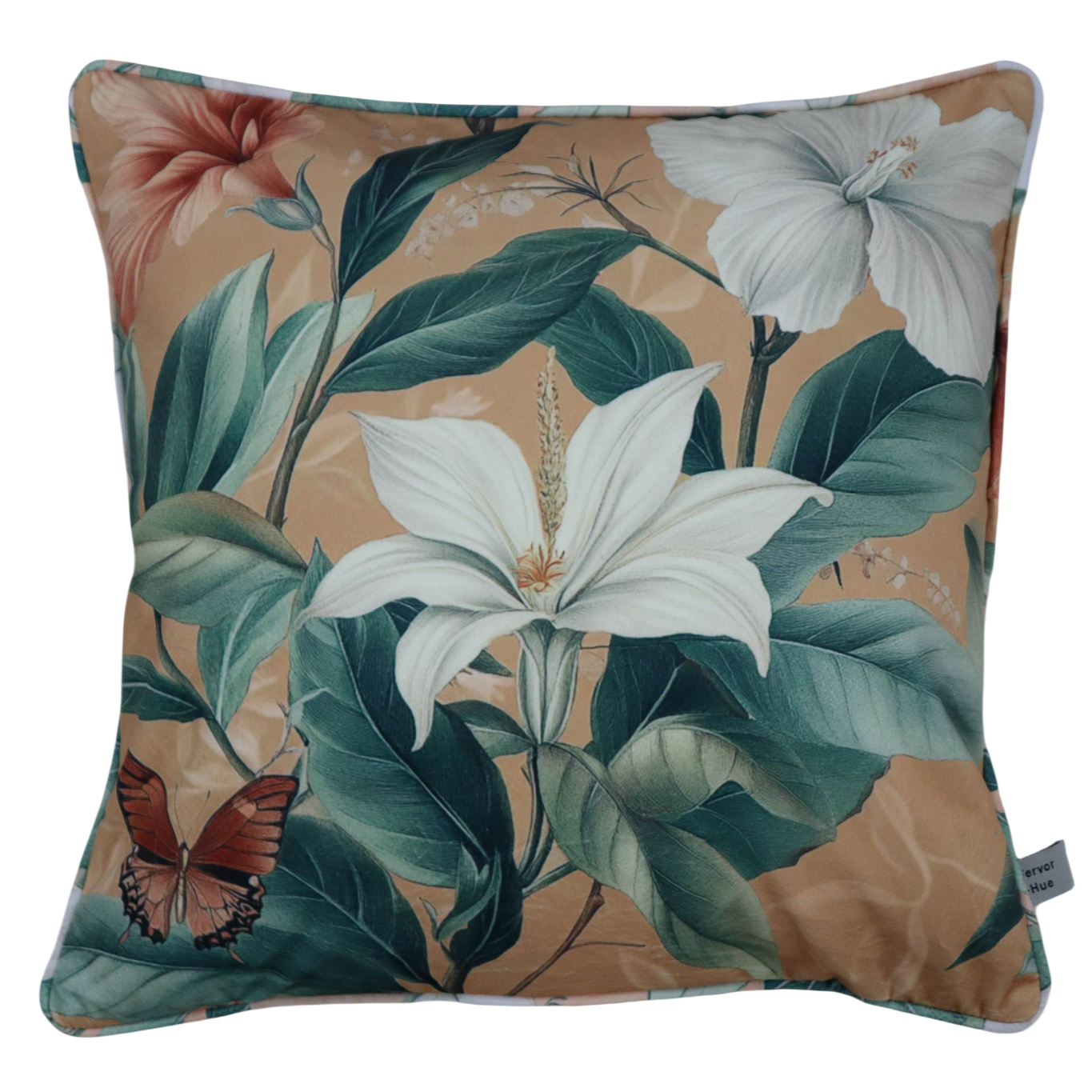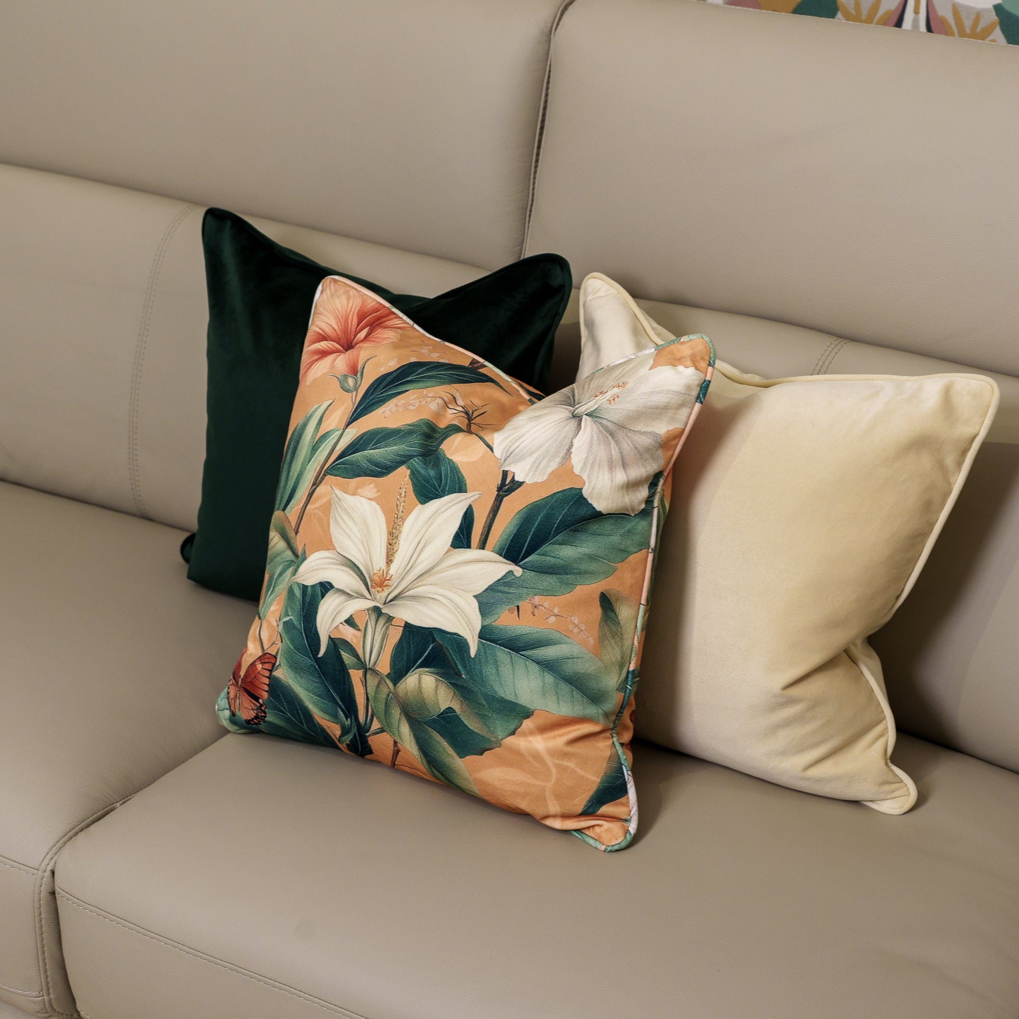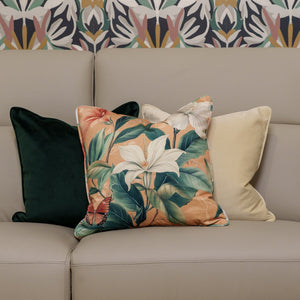 Elevate your home décor with the Floral Lilies Velvet Cushion, featuring a sophisticated botanical pattern of beautifully detailed lilies and lush green foliage set against a warm terracotta backdrop. This design captures the delicate grace of nature, combining soft cream and peach lily blooms with the subtle elegance of a vintage botanical illustration.